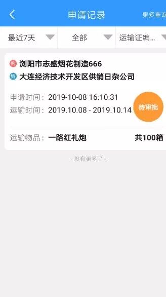 3、申請(qǐng)記錄查詢。登陸“e煙花”手機(jī)APP,點(diǎn)擊“申請(qǐng)記錄”,展示當(dāng)前運(yùn)輸證信息,點(diǎn)擊右上角“更多查詢”,可輸入查詢條件,查詢更多運(yùn)輸證的申辦信息。