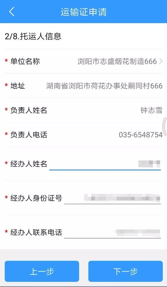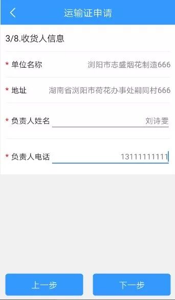 2、道路運(yùn)輸許可申請(qǐng)。登陸“e煙花”手機(jī)APP,點(diǎn)擊“運(yùn)輸證申請(qǐng)”,進(jìn)入“運(yùn)輸證申請(qǐng)”界面,按照要求填寫基本信息,自行選擇開證公安機(jī)關(guān)(啟運(yùn)地或運(yùn)達(dá)地),點(diǎn)擊下一步,進(jìn)入“托運(yùn)人信息”界面;填寫托運(yùn)人信息,點(diǎn)擊下一步進(jìn)入“收貨人信息”界面;填寫收貨人信息,點(diǎn)擊下一步進(jìn)入“承運(yùn)人信息”界面;填寫承運(yùn)信息,點(diǎn)擊下一步進(jìn)入“駕駛員/押運(yùn)員信息”界面;填寫駕駛員/押運(yùn)員信息,點(diǎn)擊下一步進(jìn)入“物品信息”界面;填寫物品信息,點(diǎn)擊下一步進(jìn)入“附件信息”界面;按照要求,點(diǎn)擊上傳相應(yīng)附件信息;上傳附件信息完成后,點(diǎn)擊下一步,對(duì)運(yùn)輸證申請(qǐng)相關(guān)信息進(jìn)行確認(rèn);確認(rèn)無誤后,點(diǎn)擊提交申請(qǐng),運(yùn)輸許可申請(qǐng)完成,提示申請(qǐng)成功并返回主頁(yè)面。