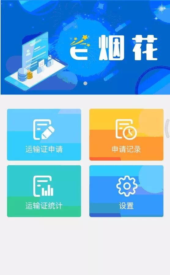 “e煙花”手機(jī)APP共有四個(gè)功能模塊:運(yùn)輸證申請(qǐng)、申請(qǐng)記錄、運(yùn)輸證統(tǒng)計(jì)和設(shè)置。從業(yè)單位可以通過“運(yùn)輸證申請(qǐng)”功能申請(qǐng)道路運(yùn)輸許可,通過“申請(qǐng)記錄”功能查詢本單位申請(qǐng)道路運(yùn)輸許可的受理、審核等狀態(tài),通過“運(yùn)輸證統(tǒng)計(jì)”功能輸入相關(guān)條件對(duì)運(yùn)輸證有關(guān)信息進(jìn)行詢查統(tǒng)計(jì),通過“設(shè)置”功能分配用戶賬號(hào)等,具體使用說明如下: